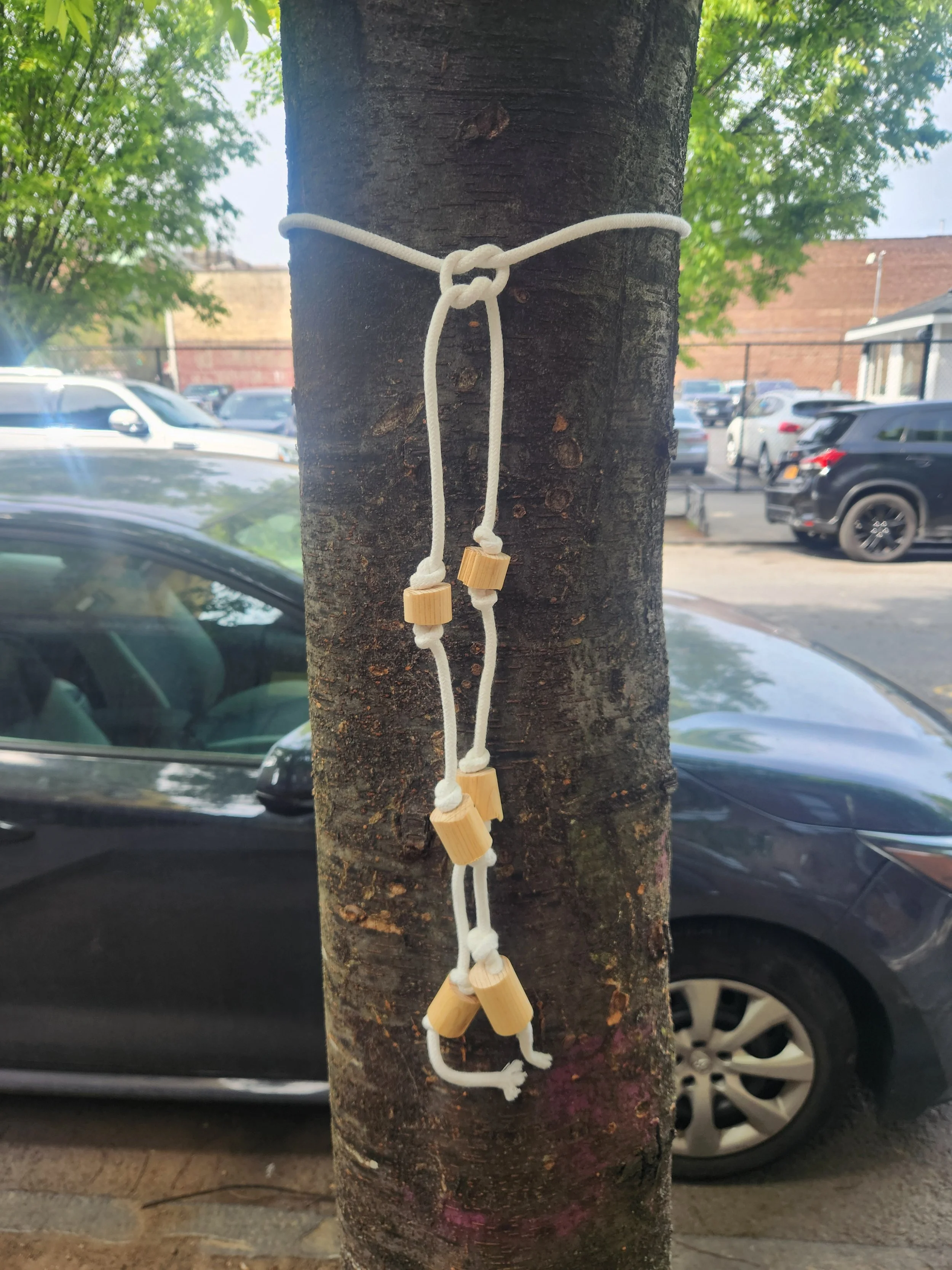 These tree satchels are designed to be fully autonomous DIY Mobile Growing containers. The Water chimes act as a watering device to pull water into the satchels during the rain. All plants and herbs used for the tree gardens will be drought-resistant, native or need little to no water. This will allow the tree gardens to be fully self-sustained outside of maintenance to repair the burlap or transferring the satchel to another tree.